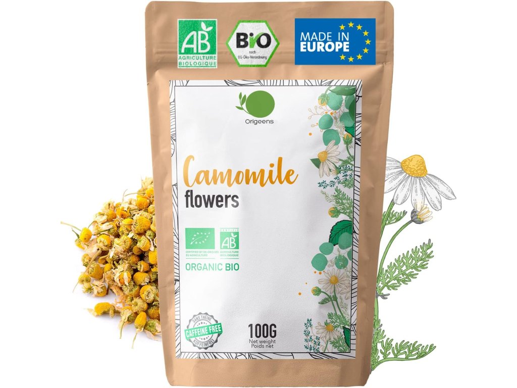 ORIGEENS ORGANIC CHAMOMILE TEA Sourced in Europe, 100g | Čaj z celého kvetu harmančeka, na trávenie a ľahký spánok | Kvety harmančeka - organické kvety harmančeka